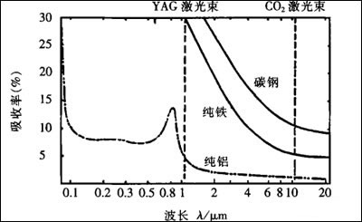 鋁及鋁合金的激光焊接難點(diǎn)在于鋁及鋁合金對輻射能的吸收很弱,對CO2激光束(波長為10.6m)表面初始吸收率1.7%;對YAG激光束(波長為1.06m)吸收率近5%。圖3為不同金屬對激光的吸收率。
